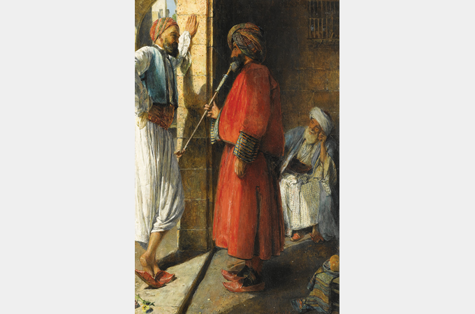 Deutsch, an Austrian artist working in Paris who first travelled to Cairo in the early 1880s, is revered for his breathtakingly observed scenes notable for their meticulous details. This year’s sale will be led by Deutsch’s Morning Prayers, a luminous masterpiece of 1902. Estimated at £500,000-800,000 ($706,000-1.13 million), the work demonstrates the artist’s respect for Muslim worship. A powerful and noble evocation of the rites and religion of the Muslim world, Morning Prayers depicts two men absorbed in prayerful contemplation, facing towards the mosque’s mihrab indicating the direction of the Ka’ba in Makkah. The identity of the mosque which forms the setting of the work is not known. The lack of architectural detail and the simplicity of the backdrop serve to focus attention on the prayer sequence which so captivated Deutsch and other Orientalist painters used to Christian worship. The minute detail and photographic realism of the painting, from the mother-of-pearl inlaid kursi cabinets and Syrian pendant lamp to the Persian Sauj Bulagh rug – a myriad of textures and surfaces, hard and soft – betrays Deutsch’s rigorous academic training in Paris.