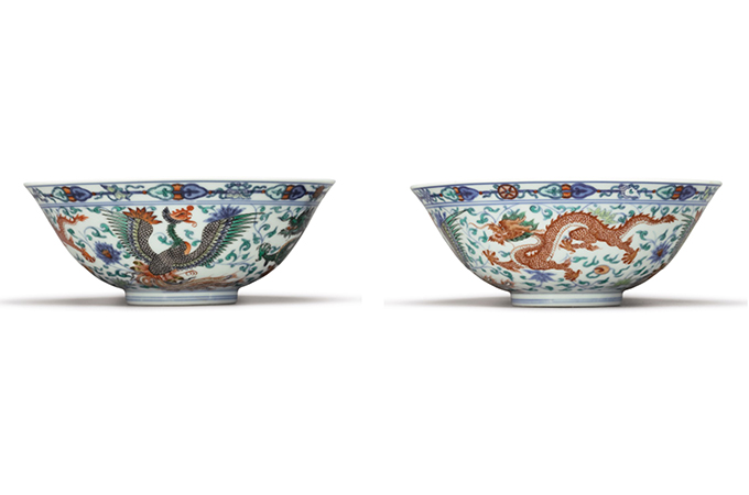 Next on sale was a pair of rare Wucai and Doucai 'Dragon and Phoenix' bowls with Yongzheng marks that became the property of an Asian buyer for $874,000.