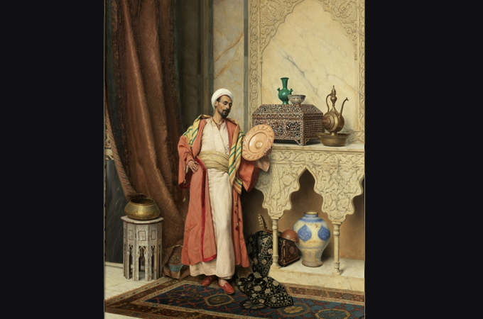 Bey’s paintings reflect his years of study with Gérôme and Boulanger, but as the leading travel writer and authority on the Muslim world Barnaby Rogerson writes in the current edition of Bonhams Magazine: “In his works, he was not throwing together random picturesque objects, but composing a loving tribute to his homeland which for centuries had created dazzling ceramics, textiles, buildings, carpets, gardens and texts that his paintings assembled.”